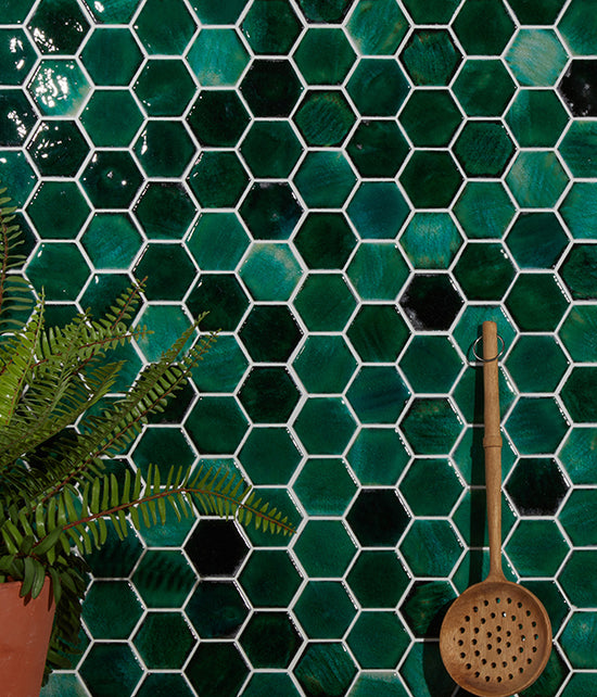 The Akazu pottery of medieval Japan is prized worldwide for its unique handmade gloss enamel. Echoing this varied, organic look, our Akazu mosaics come in 2 jewel-like tones and a hexagon shape for a mouth watering varied effect.