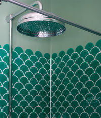 Swimming their way into bathroom and kitchen interiors, these scallop porcelain mosaic tiles will add drama to any design scheme. The mosaic tiles are inspired by the coast with a bright blue and vivid green colour palette. The crackle glaze adds a beautiful iridescent finish to these fish scale shaped tiles.