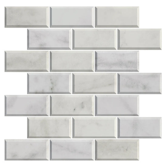 Here you can see our Carrara marble in the bevelled metro mosaic format. With a sleek honed finish this tile format is perfect for creating the perfect splash back, why not match these along with one of the other Carrara tile formats on the walls and floor.