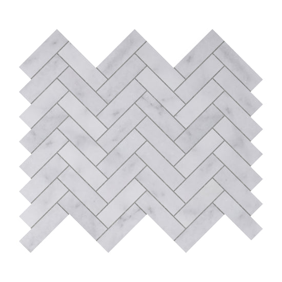 Available here is our Carrara in a modern herringbone mosaic format. This tile is bound to spruce up your interior space, match this mosaic format with either the square or rectangular Carrara tiles to create the perfect seamless design scheme.