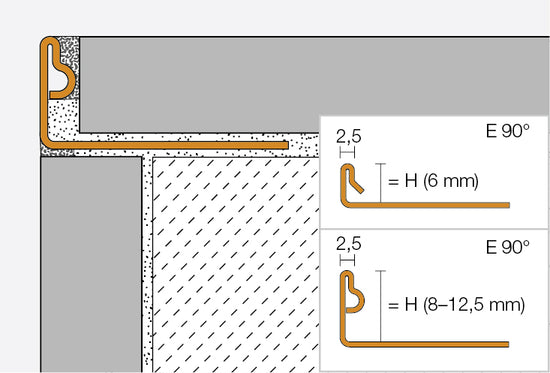 Schlüter-JOLLY is a decorative metal profile to finish and protect tiled external wall corners and other tiled edges, e.g. tiled skirting. The 90 degree angled finishing leg safeguards tiles against mechanical damage. The joint spacers on both sides create a uniform grout joint with the tile.