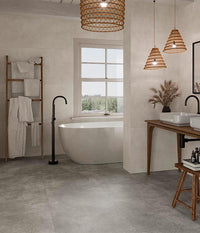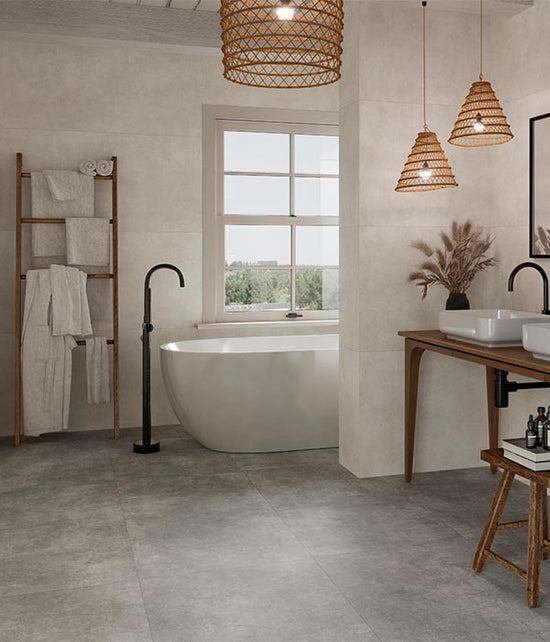 A simple, understated range of concrete-effect tiles which pair beautifully with any furniture styling and contrasting tile choices.
