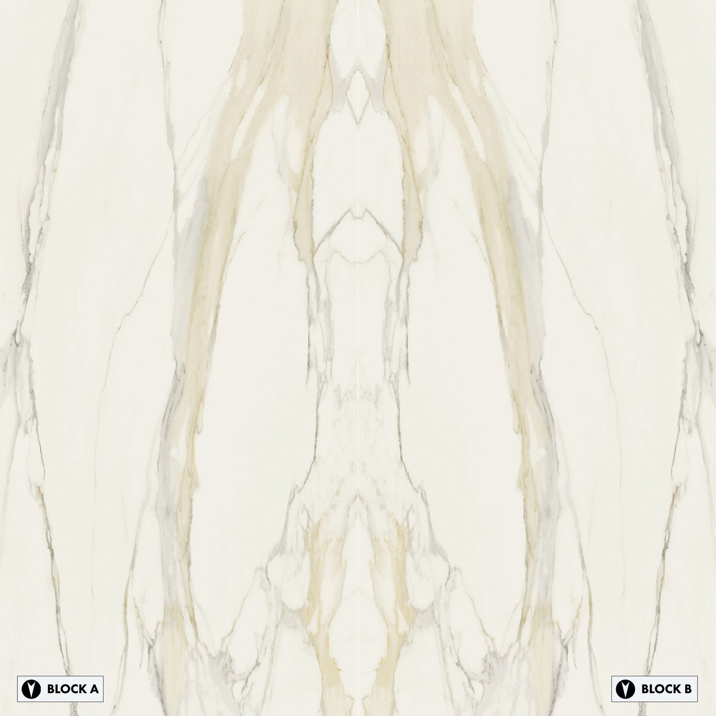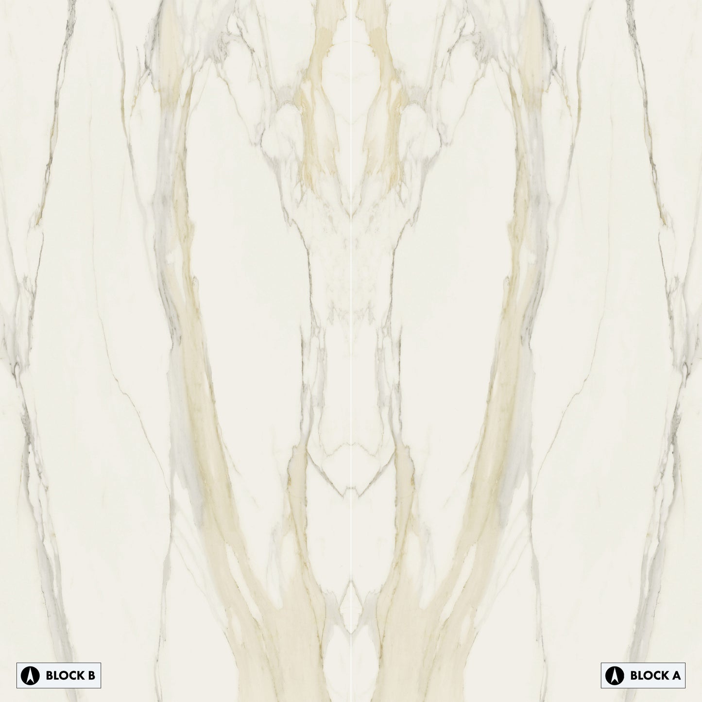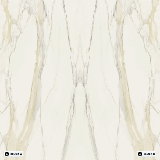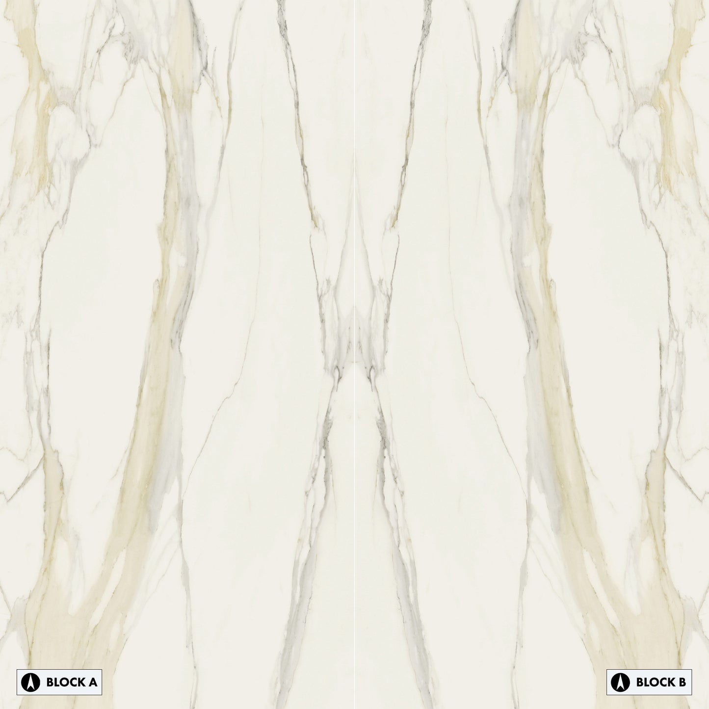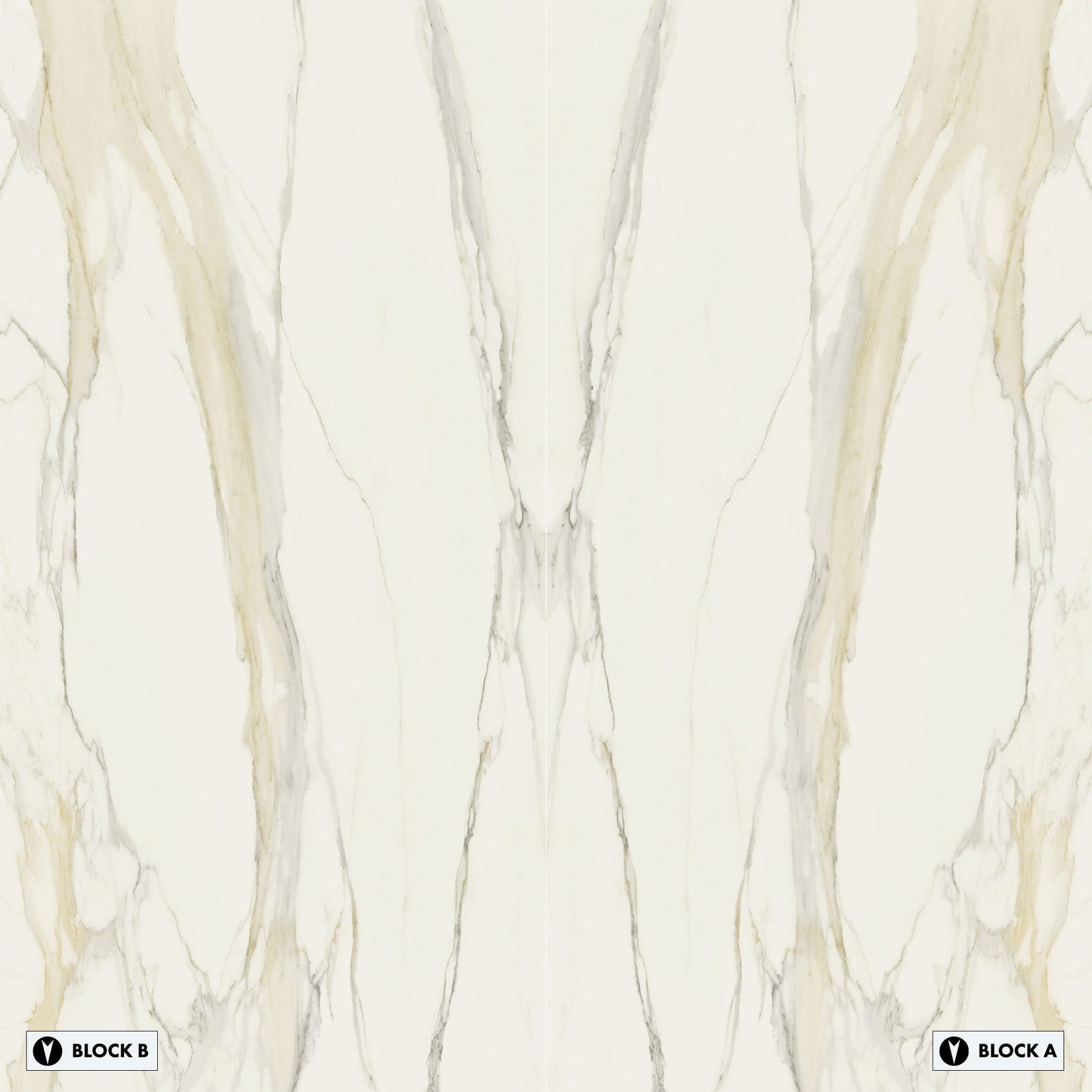 Marmi Calacatta Gold Bookmatch (Glossy) creates a visually striking mirrored pattern where creamy white stone meets luxurious golden veining in perfect symmetry. The bookmatched layout of Face A and Face B enhances architectural drama, making it a go-to surface for upscale focal walls and artistic interior compositions.