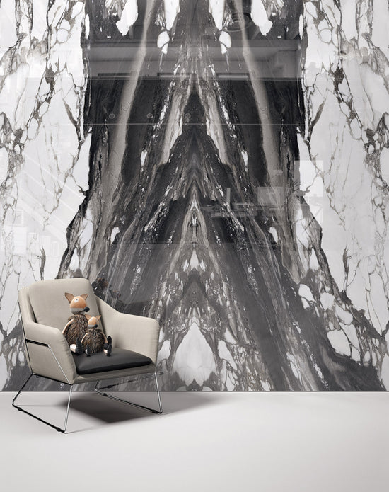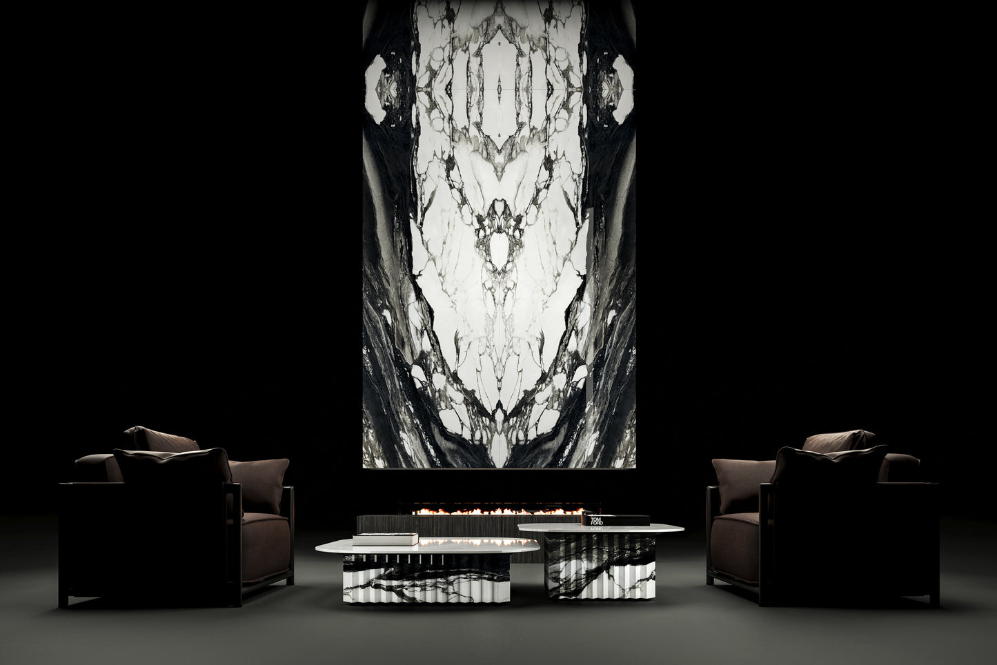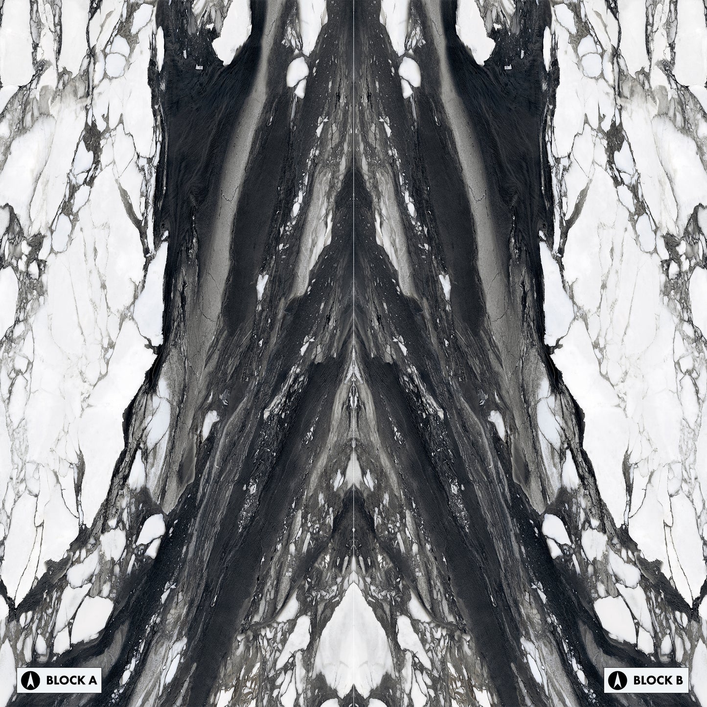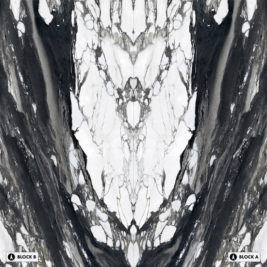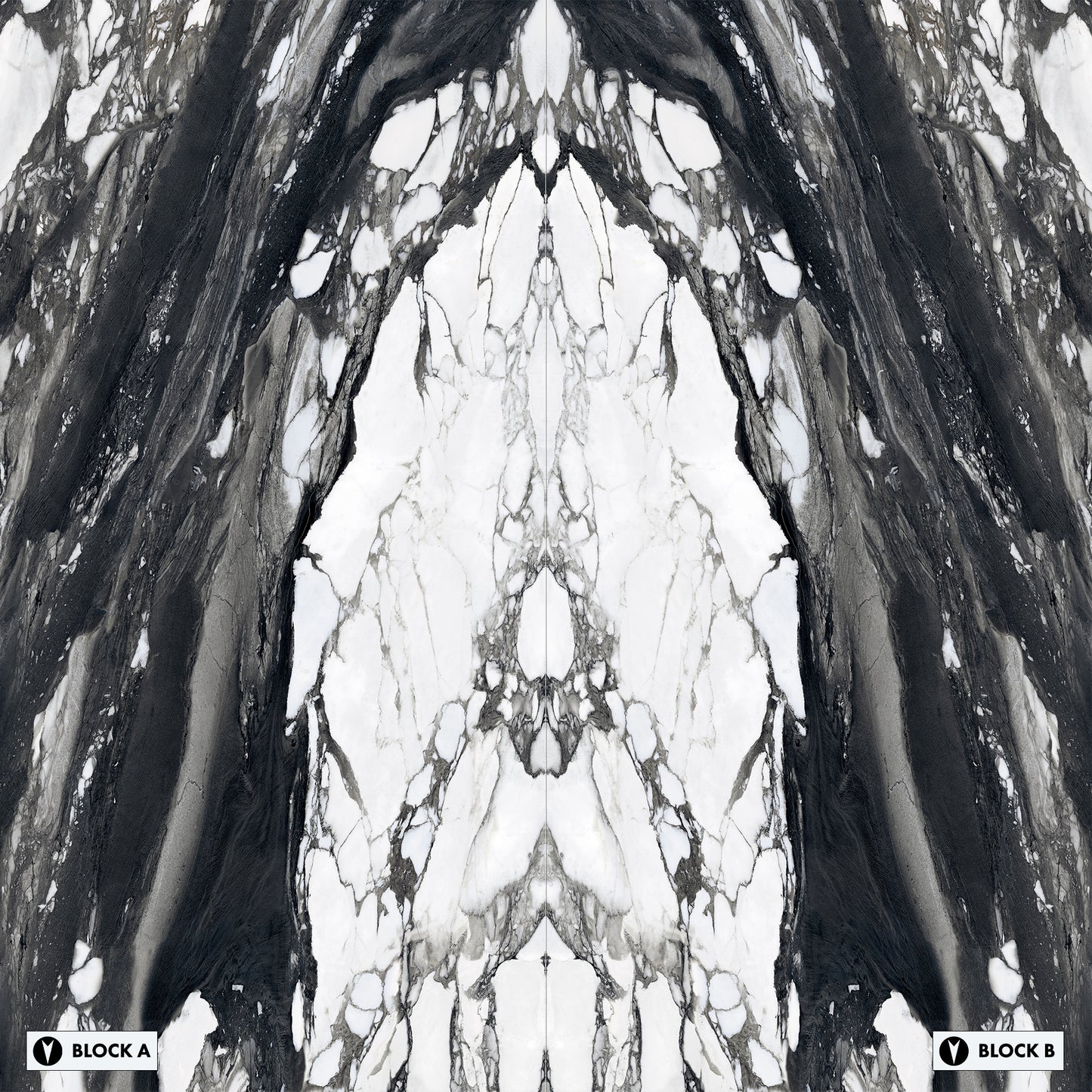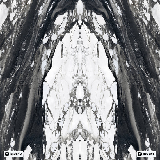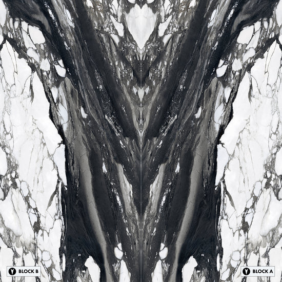 Marmi Calacatta Renoir Bookmatched (Full Lappato) elevates the drama of natural stone through mirrored symmetry and painterly intensity. The bookmatched layout blends intense black veining, cloudy greys, and bright white backgrounds into a powerful, architectural centerpiece ideal for gallery-like interiors.