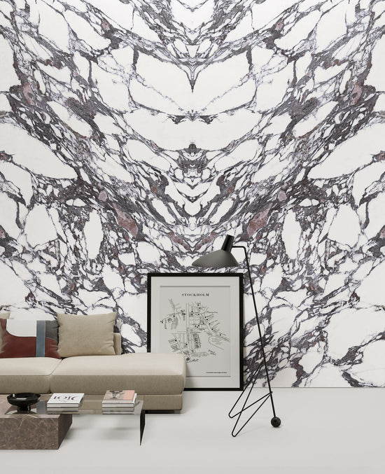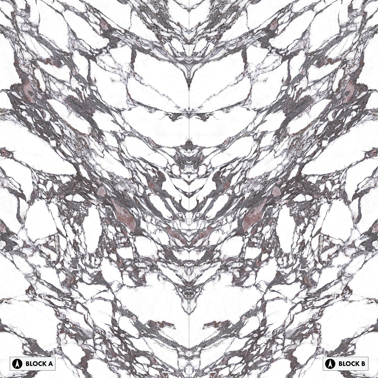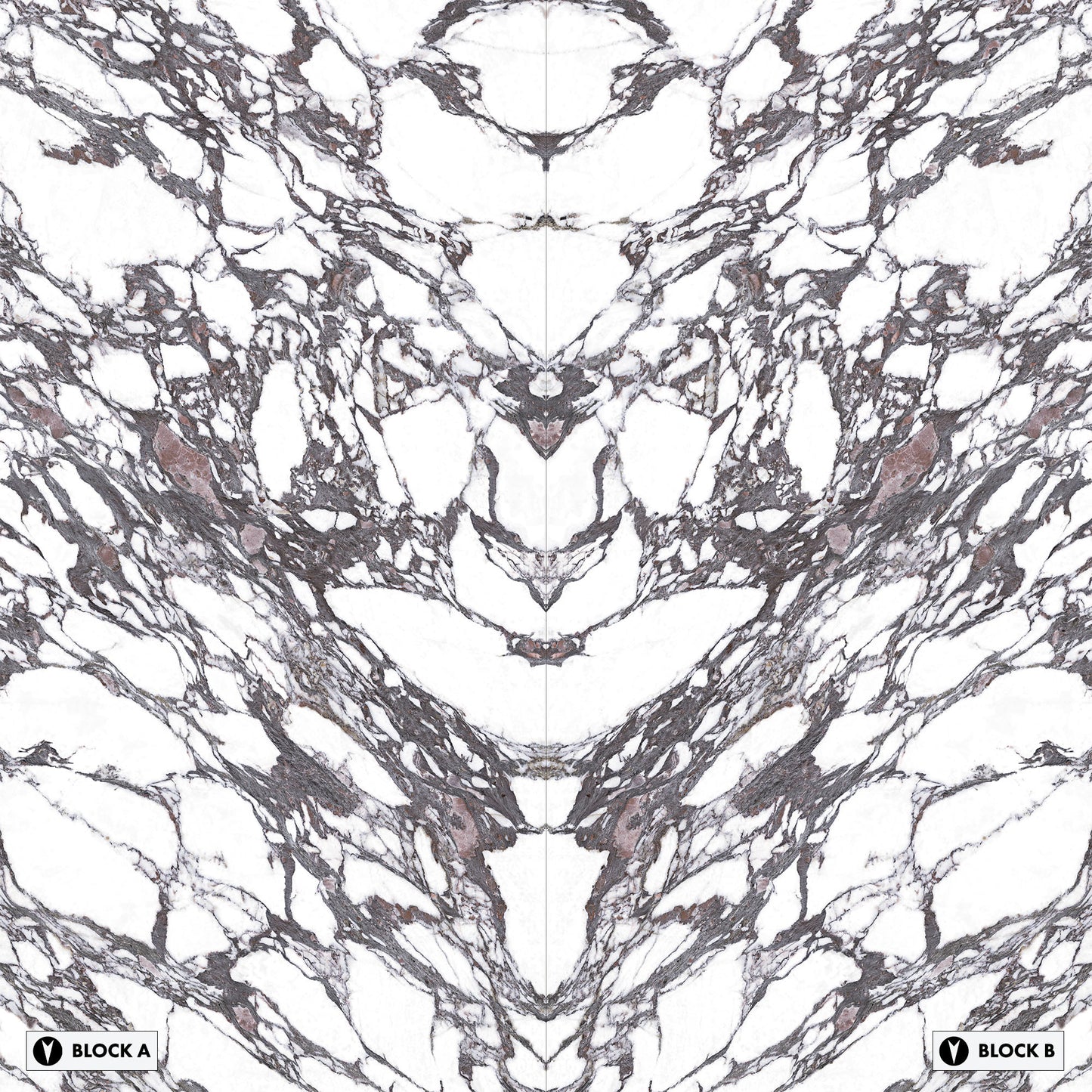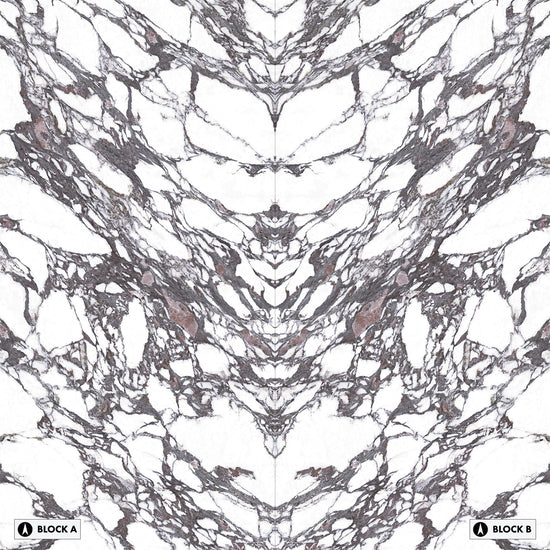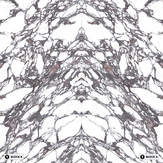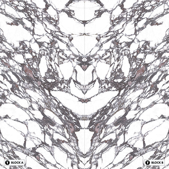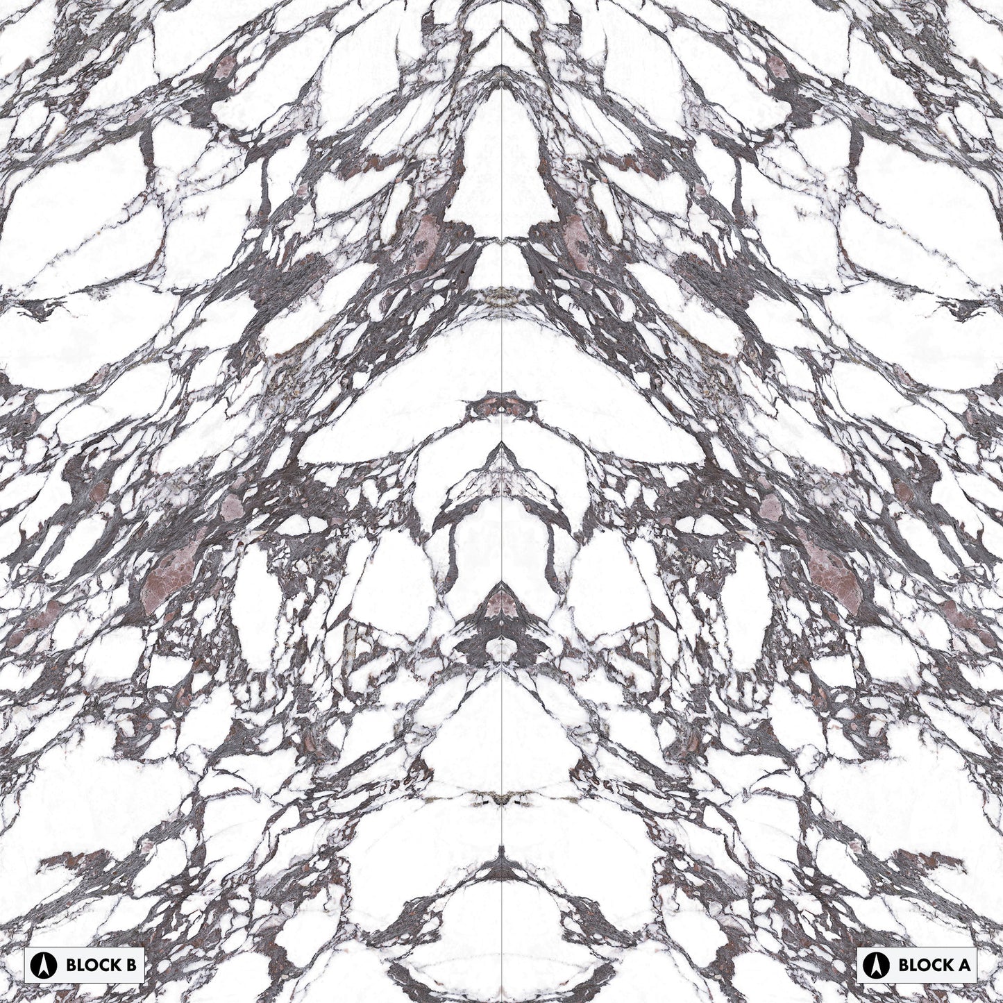 Marmi Calacatta Viola Bookmatched (Full Lappato) makes a dramatic design statement with its rich violet and burgundy veining mirrored across Faces A and B. Set against a bright white background, the bookmatched layout forms a symmetrical, artistic centerpiece ideal for high-impact vertical surfaces.