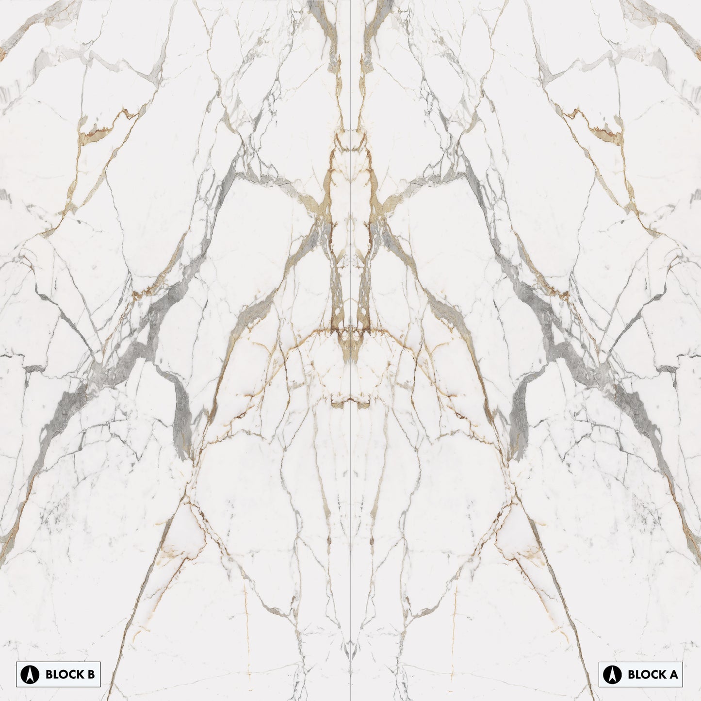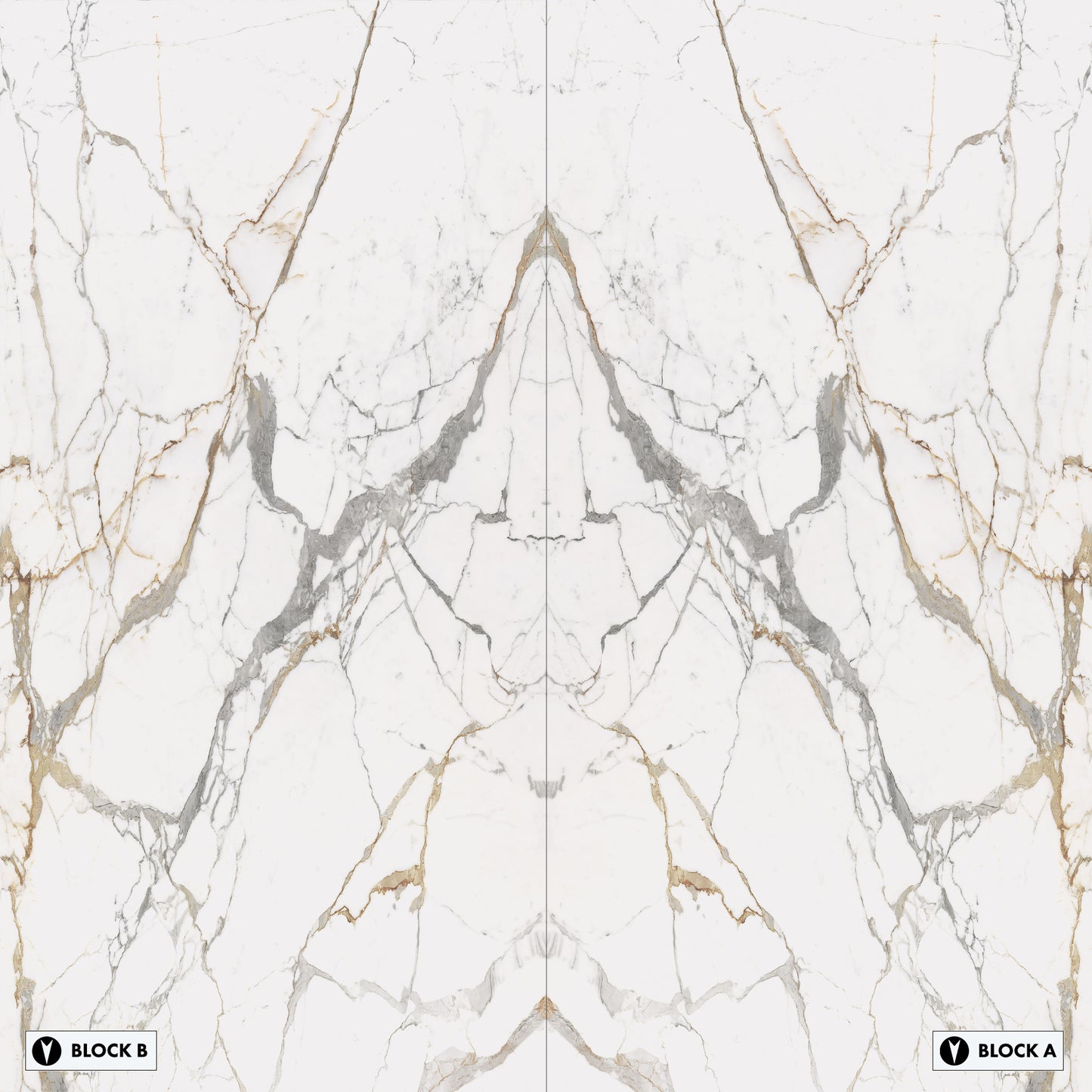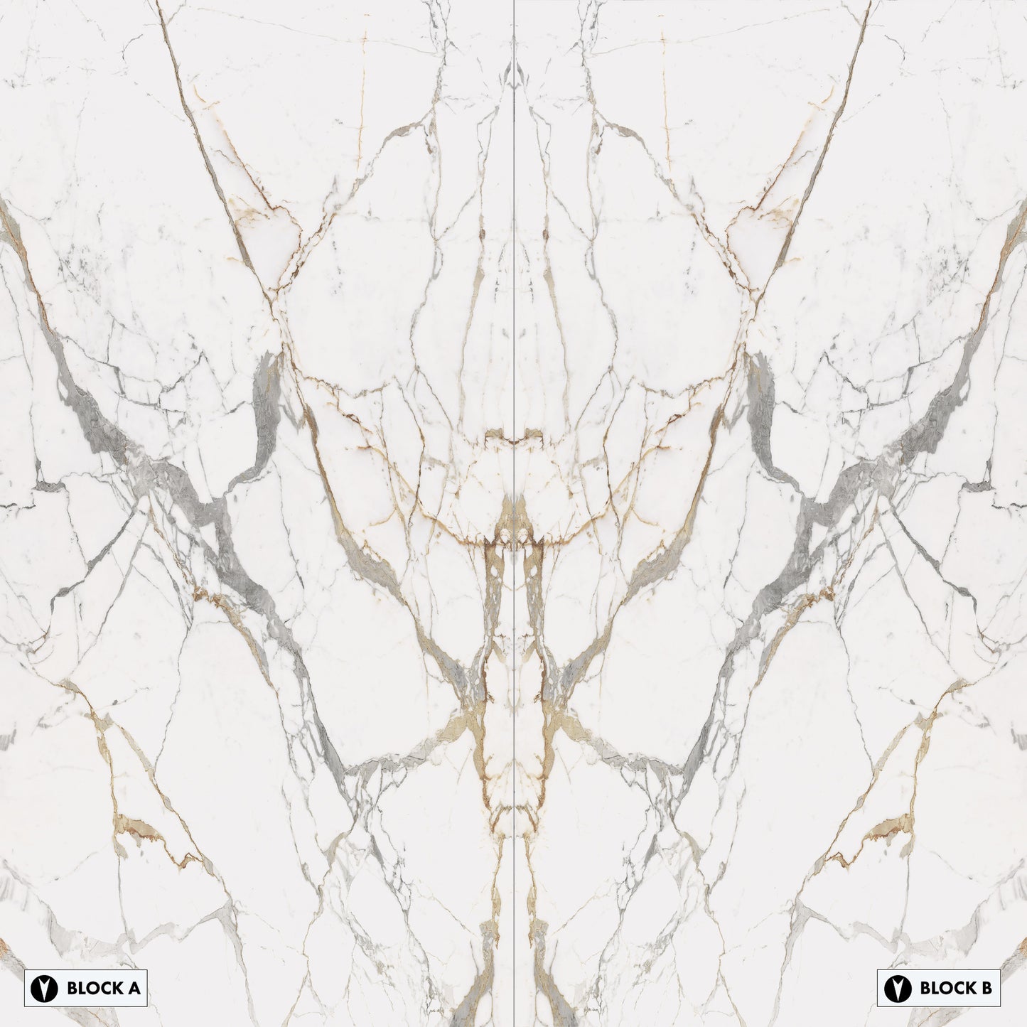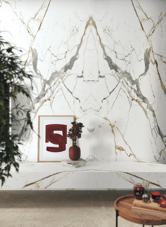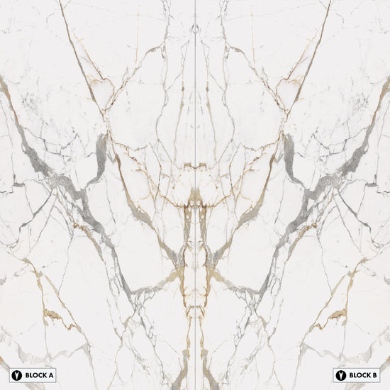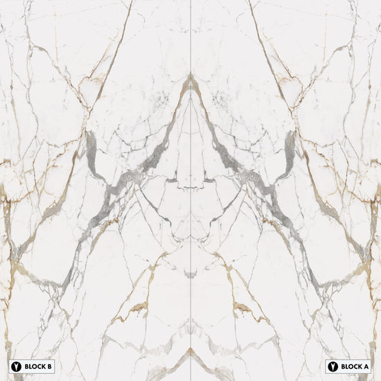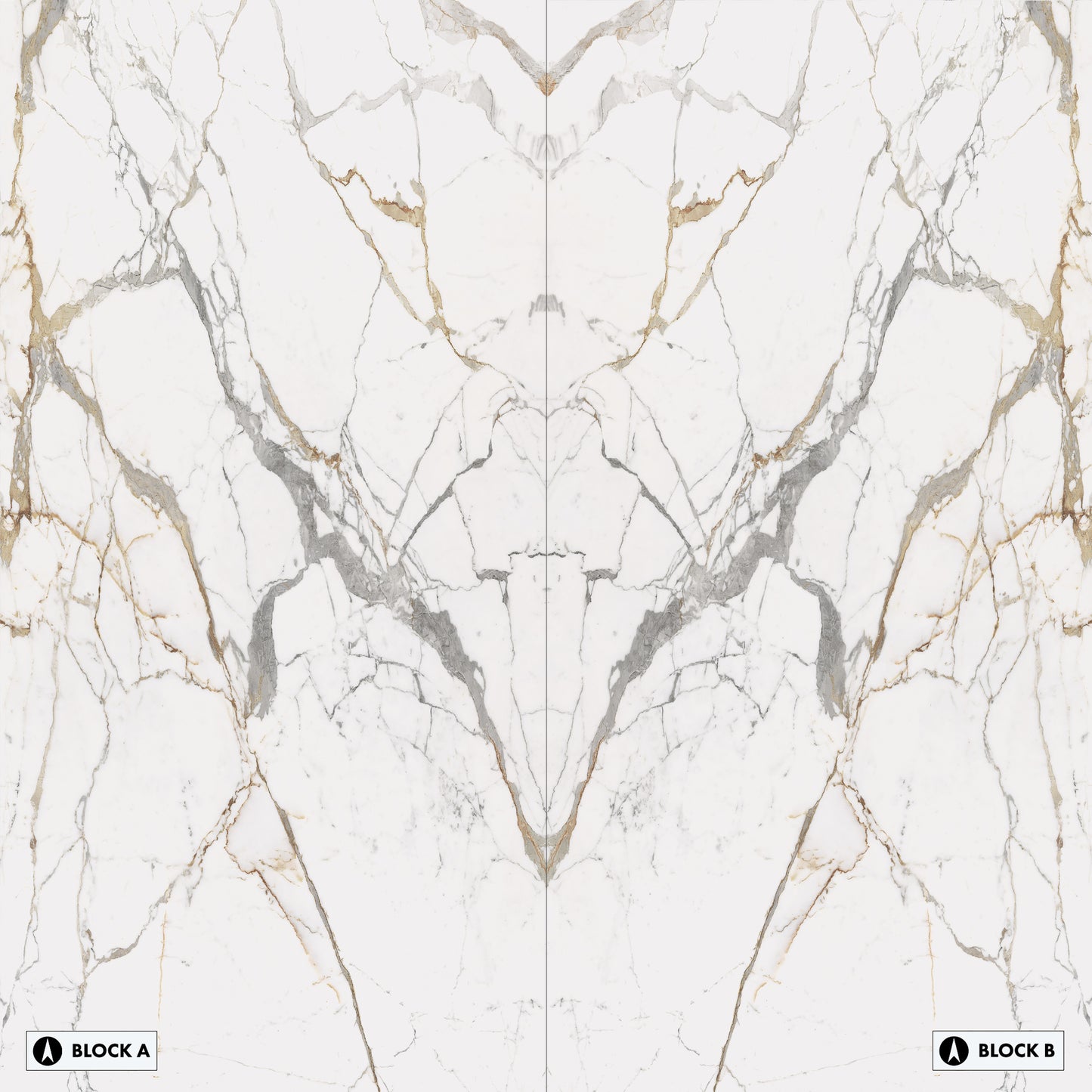 Marmi Eternal Gold Bookmatched (Glossy) celebrates opulence and precision with its luxurious white base and intricate gold and silver veining. The mirrored bookmatched layout creates a dramatic visual centerpiece, while the high-gloss finish enhances colour vibrancy and adds a refined sheen to interior surfaces.