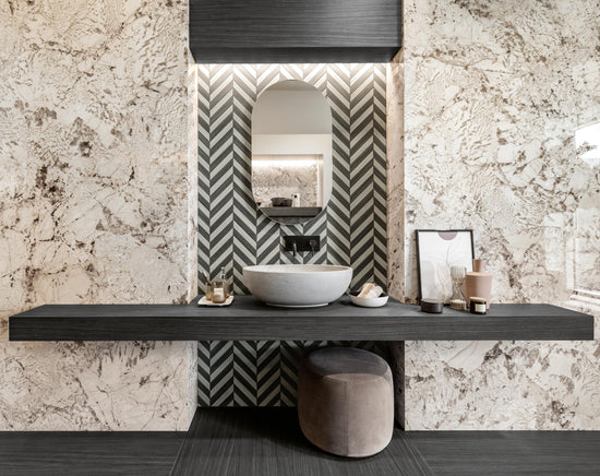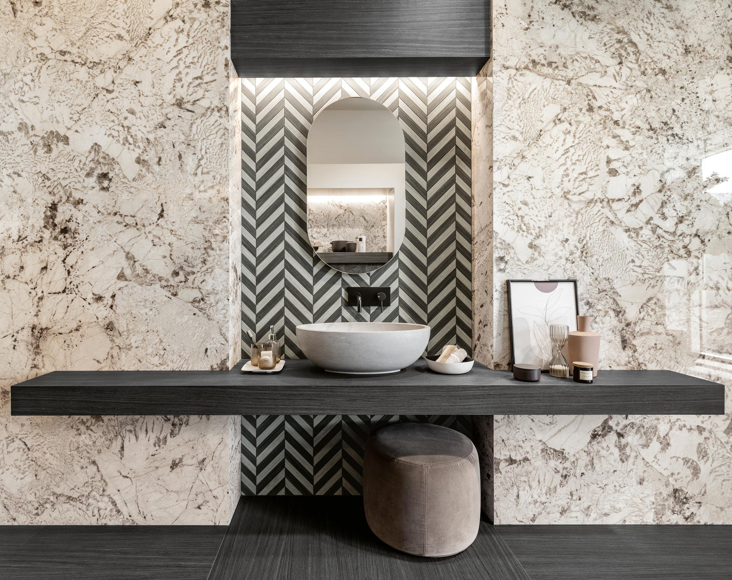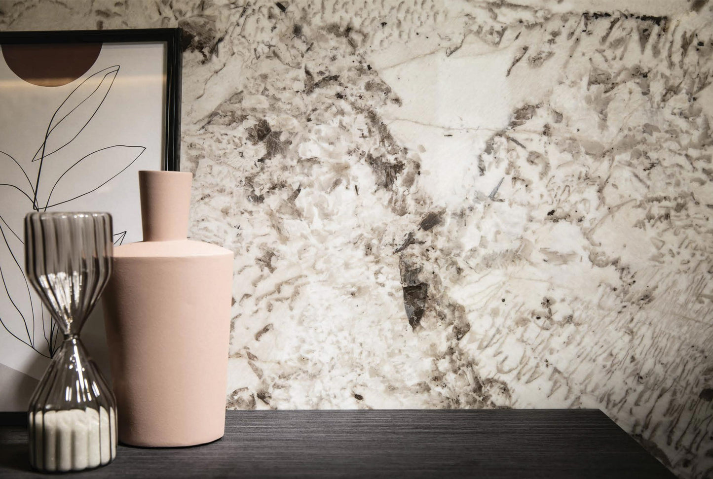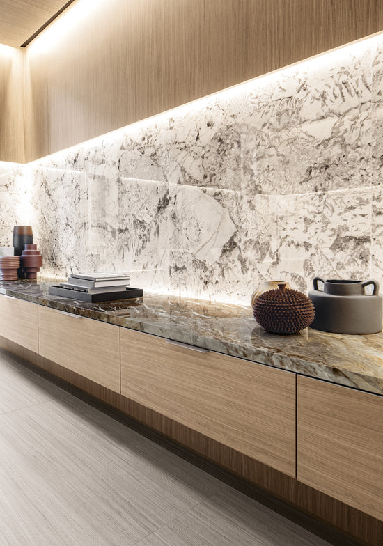 Marmi Glacier (Glossy) showcases a dramatic blend of mineral textures and earthy beige tones, capturing the complexity of glacial stone in a refined high-gloss finish. Its polished surface enhances the natural veining and organic layers, offering visual depth and sophistication.