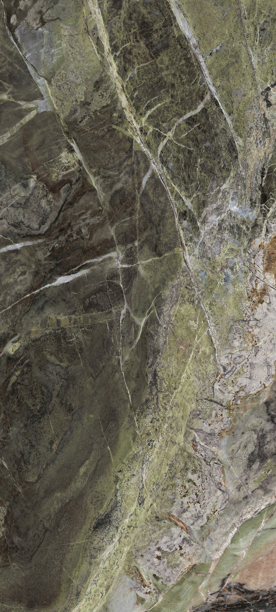 - Multi-tonal green palette with raw stone veining and mineral streaks
