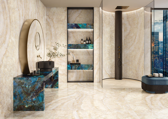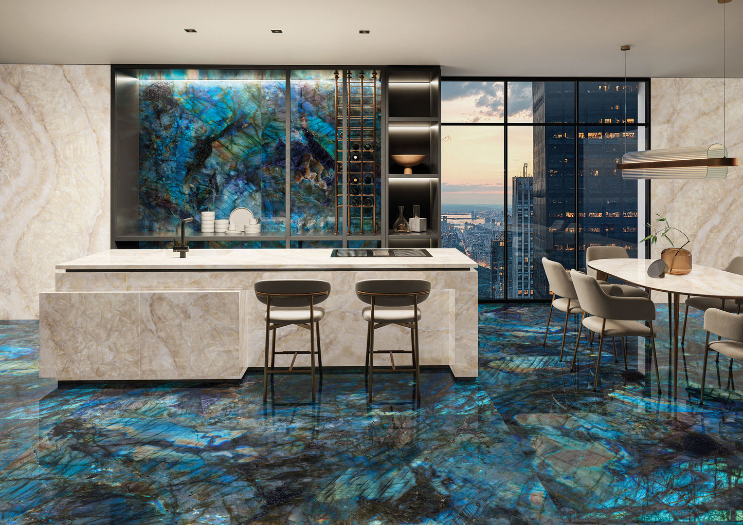Marmi Labradorite (Full Lappato) channels the captivating iridescence of the semi-precious Labradorite gemstone. With radiant blues, teals, and emerald undertones layered against deep mineral veining, this slab creates a mesmerizing play of colour and depth.