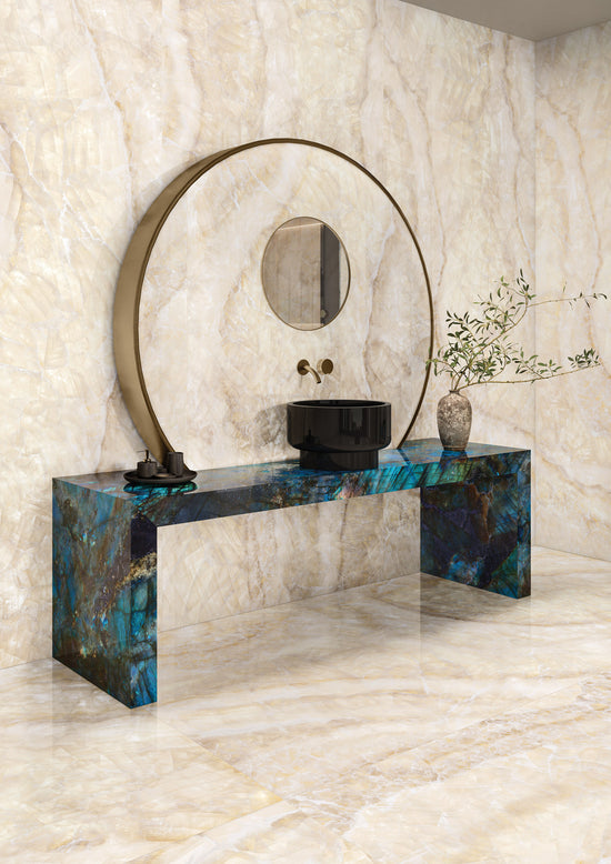 Enhanced by the Full Lappato finish, the slab’s surface glows with polished elegance, making it a perfect statement material for upscale interiors and expressive design environments.