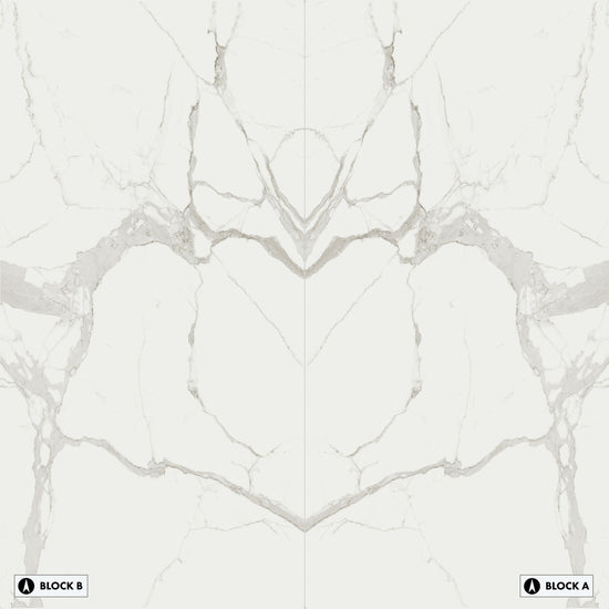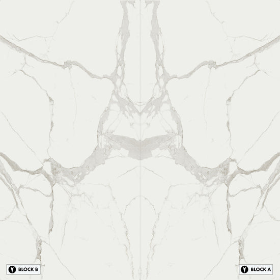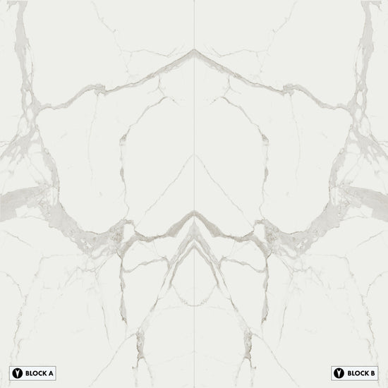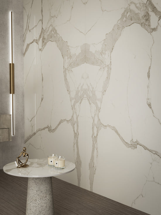 Marmi Marble Statuario Bookmatched (Glossy) This large format porcelain slab features a high-gloss surface that enhances the slab's colour depth and reflection. Its bookmatched layout creates a mirrored, symmetrical design -ideal for impactful feature walls.