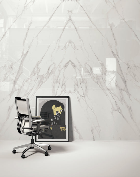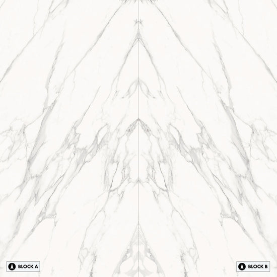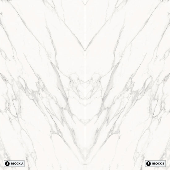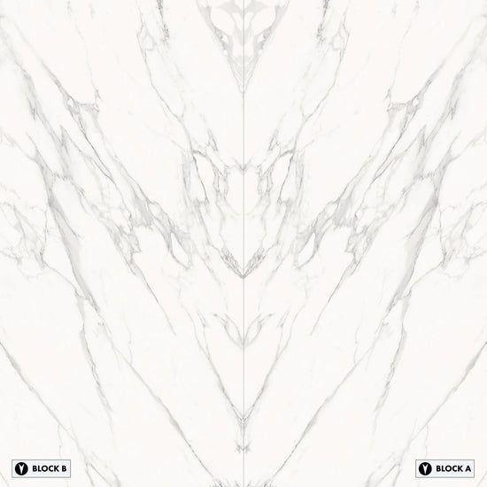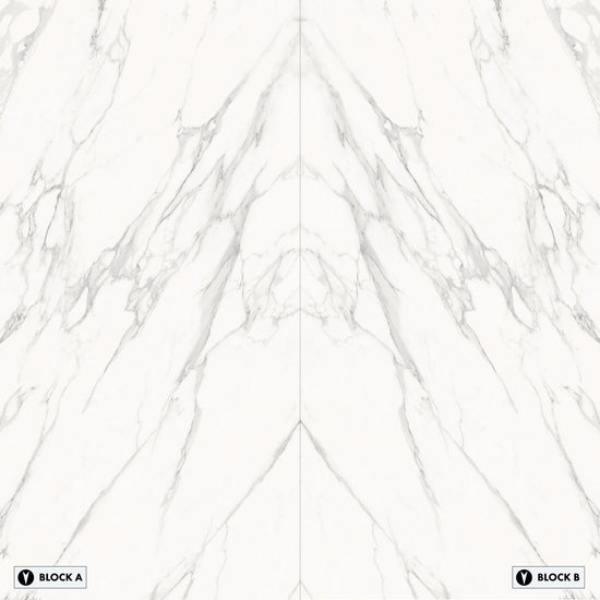 Marmi Statuario Michelangelo Bookmatched (Lappato Matte) This large format porcelain slab has a smooth matte finish that offers a natural, low-sheen texture ideal for calm interiors. Its bookmatched layout creates a mirrored, symmetrical design -ideal for impactful feature walls.