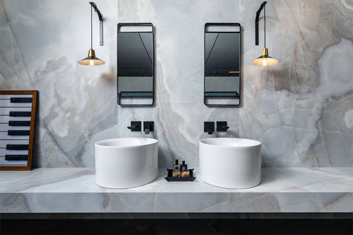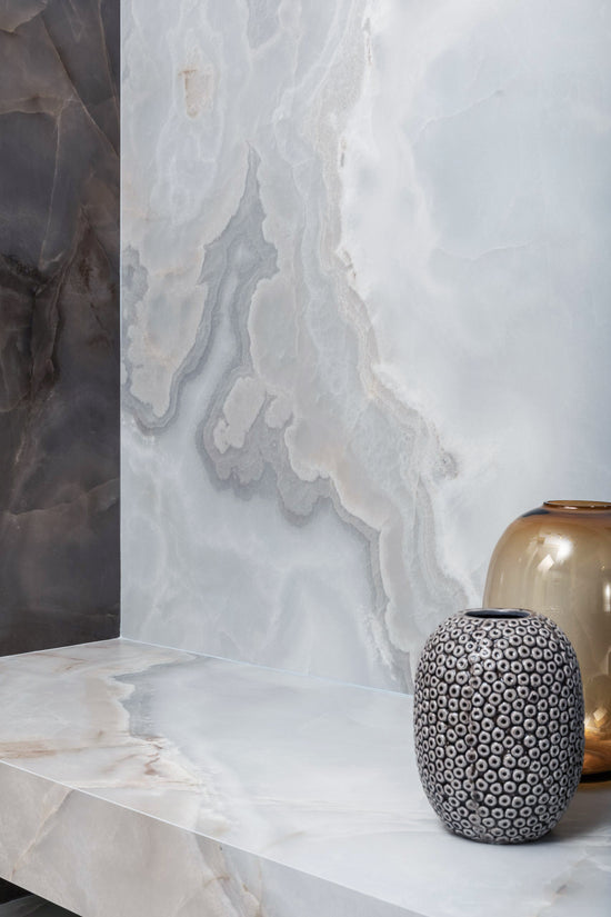 Onici Reve Choco (Glossy) This large format porcelain slab features a high-gloss surface that enhances the slab's colour depth and reflection.