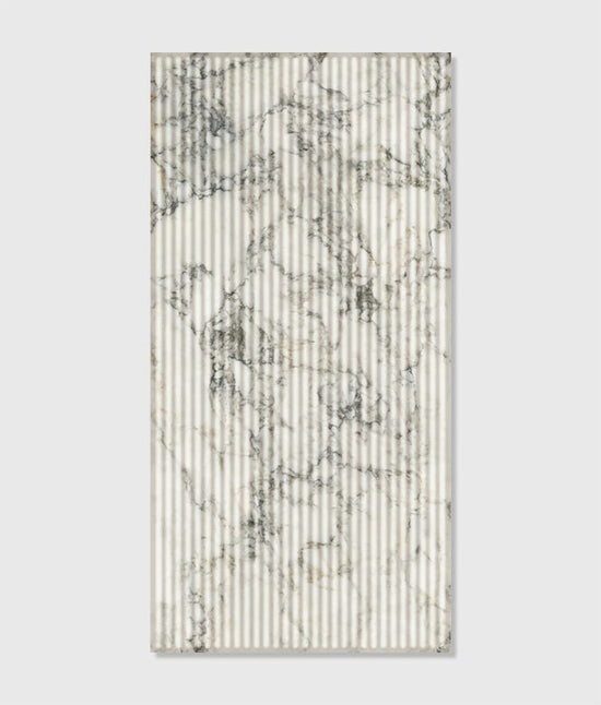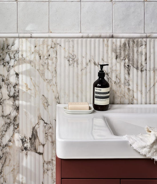 Inspired by the clean, natural style found in the iconic city of Palm Springs, California, these marble effect tiles come with a beautiful fluted option for textural opulence, a matching flat tile, and a rounded beading to really complete the effect.