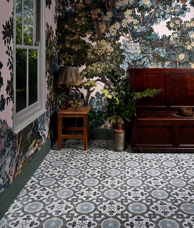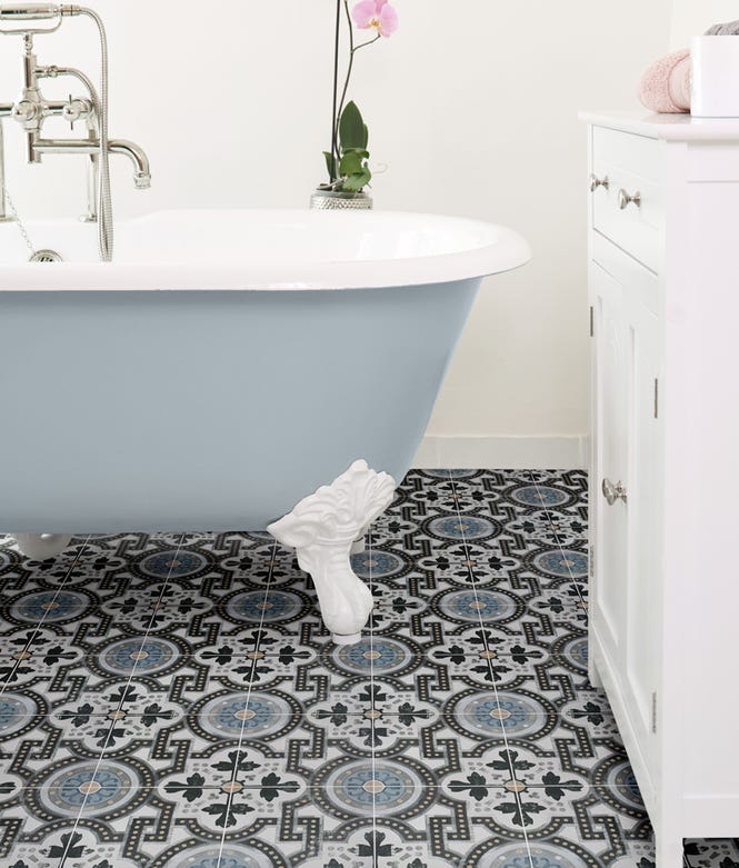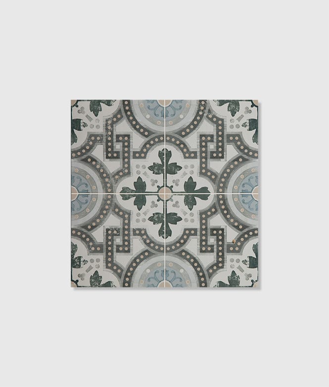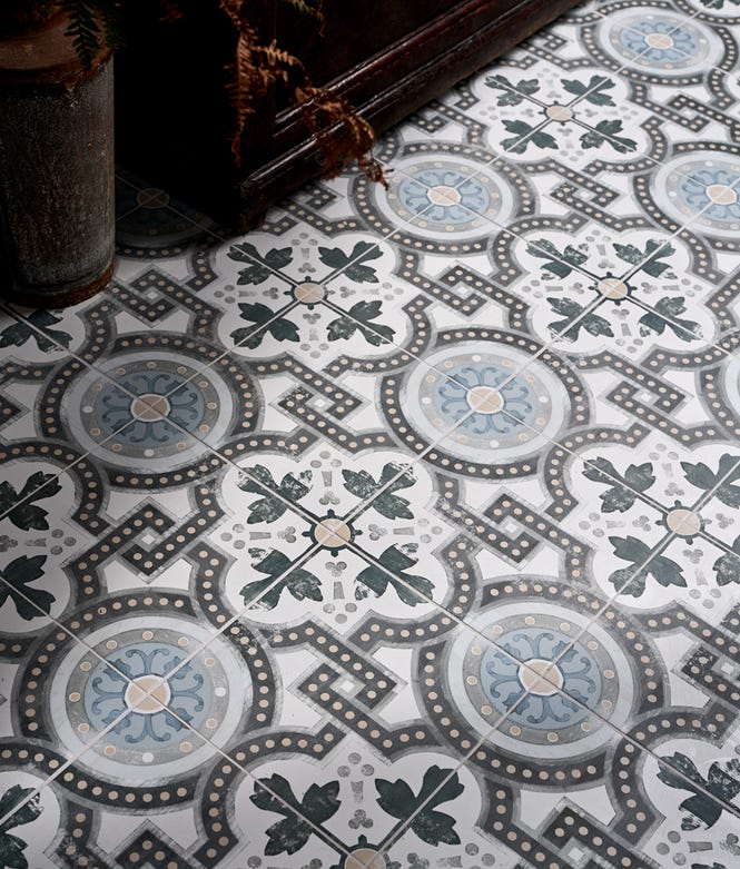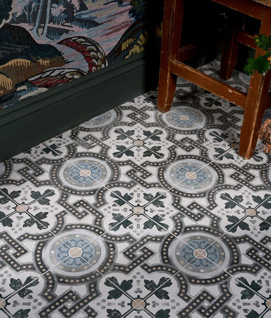 Orleans creates a distinctive pattern with vintage character and an elegantly worn effect. This tile comes as a larger tile with a prescored grout joint down the centre, designed to give the effect of smaller tiles in a more cost-effective way.