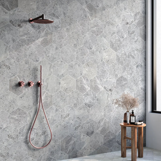Now available in this bold hexagon design, this format gives an additional stunning edge to what the natural stone itself already gives. Perfect to be used throughout a cloakroom floor to add a modern edge.